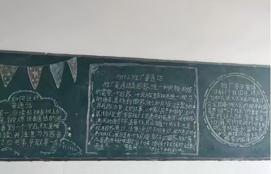 在推广普通话主题班队课上,各班辅导员老师利用黑板报和PPT营造推普氛围,利用教室多媒体刊播“推普”公益短视频,集中学习“推普”专题课。