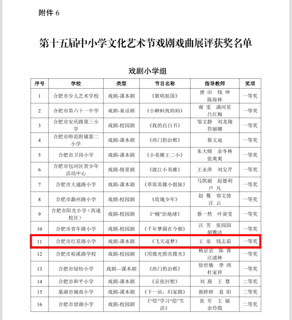 为推进五育并举,落实立德树人根本任务,促进学生全面发展,2024年上半年,合肥市教育局组织了第十五届中小学文化艺术节戏剧戏曲展评等活动。合肥市红星路小学课本剧《飞天逐梦》凭借其深刻的主题挖掘、精湛的演技呈现以及创新的编排设计,荣获了戏剧小学组一等奖的荣誉!