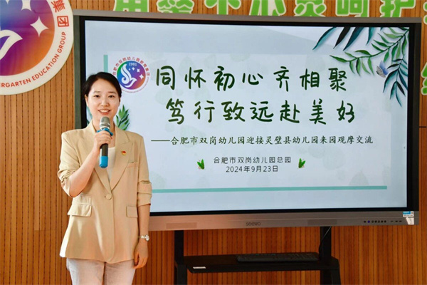 “一花独放不是春,万紫千红春满园”。为了提升教师专业能力,丰富课程资源建设的方法和经验,增进同行间的学习与交流,促进优质教育资源的共享。9月23日,合肥市双岗幼儿园教育集团总园迎来了灵璧县幼儿园园长一行人来园观摩。