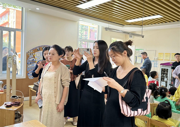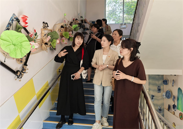 园长们在范然的组织下分成三组进行环境观摩,园长们依次走进各年龄段班级和公共区域进行观摩,各班级融合基础课程和幼小衔接,主题墙和游戏墙结合本年龄段幼儿的兴趣点和问题点,预设主题路径和脉络,结合传统文化创设了“青花瓷”、“水墨童年……等主题。游戏墙融合了 steam+的概念,支持幼儿游戏每一个阶段的深入探索,关注主题活动的关联性和深入性,在墙面上形成幼儿持续、递进的学习经验链。