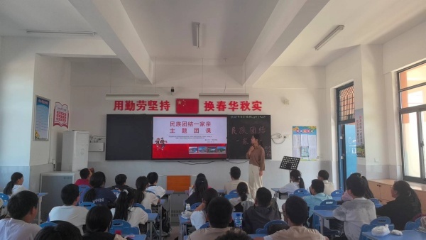 9月24日上午,由学校团委举办的以“石榴籽一家亲”民族团结主题团课展示活动在七(1)班举行。
