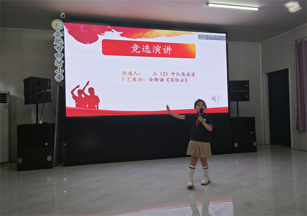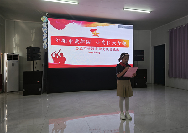 红领巾飘扬永不褪色,少先队员争做时代先锋!为进一步加强和规范学校少先队队伍建设,增强少先队员的民主意识、参与意识和竞争意识,培养与提高少先队小干部的自身素质和工作能力,充分发挥少先队小干部在少先队工作中的积极作用,9月27日下午,合肥市四河小学少先队大队开展了“红领巾爱祖国 小岗位大梦想”2024—2025学年度少先队大队委竞选活动。