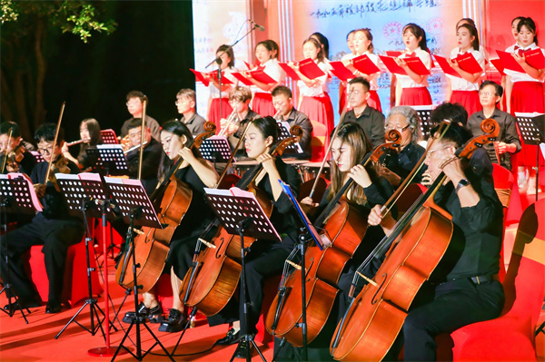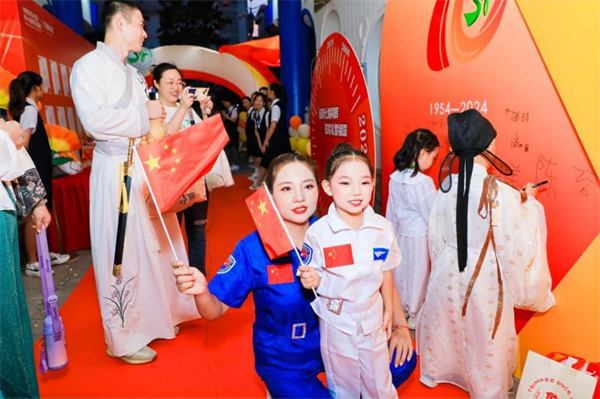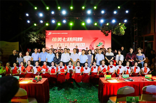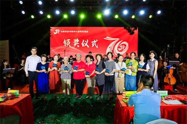 活动最后,特邀合肥市庐阳区教体局吴启恩主任登台指挥,六安路小学李柯棣老师和南门小学丁锵锵老师倾情助力,共同领唱《歌唱祖国》,将展演活动推向高潮。现场观众全体起立,挥舞国旗,共同为祖国繁荣高歌。在这里,我们书写下绚丽华章;在这里,我们也将继续扬帆起航!