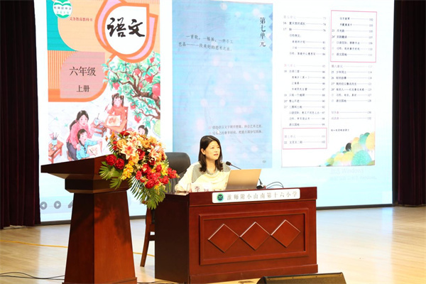 案例展示环节,庐阳区教研室副主任李霞以统编教材小学语文六年级上册第七单元整体教学设计为例,从“跨学科学习内涵解读”“单元整体设计说明”以及“跨学科学习活动设计”三方面依次展开跨学科学习主题分享。李霞指出,跨学科学习要注重多角度体验、多角度探究以及多元化融通,思考跨点、跨度、跨程,始终坚持学科本位,丰富学生的语文学习感受。