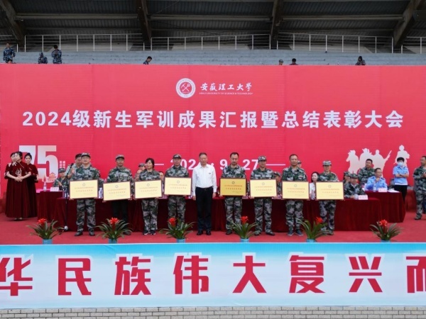 9月27日上午,安徽理工大学2024级新生军训成果汇报暨总结表彰会在淮南、合肥两地同步举行。参训学员身着戎装,以严整的军容、饱满的精神展示军训成果。校党委常委、副校长、校军训工作领导组副组长宫能平、王先江,承训部队驻校首长出席活动。