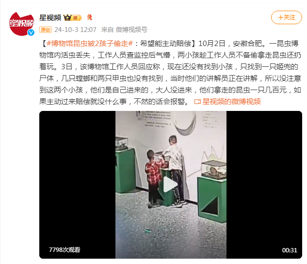 10月2日,安徽合肥园博园昆虫记·昆虫博物馆工作人员爆料,有男孩打开昆虫箱偷拿多只活螳螂甲虫,还扔着玩,事后发现一只昆虫死了。目前正在排查联系当事人。