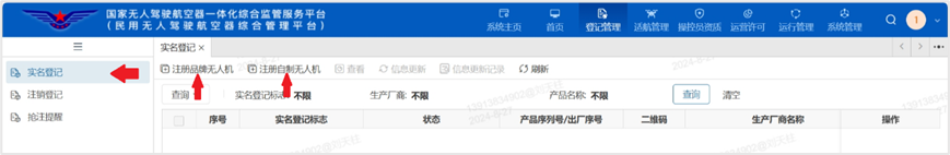 进入平台首页,点击右上角登记管理,“实名登记”,注册品牌无人机,验证信息,手机扫码验证,选择生产商名称,选择型号等相关信息(手动输入序列号),上传照片。