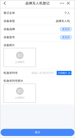 信息登记完毕后,点击设备登记,根据设备情况,选择相应类型登记注册,(以品牌无人机为例)根据页面提示,填写设备品牌与型号,并上传设备照片与机身序列号。