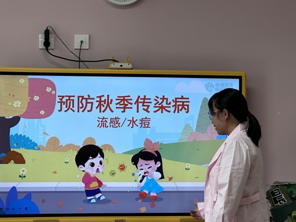 保健医刘国臣走进大一班,结合大班幼儿的年龄特点,她围绕“秋季常见的传染病—流感、水痘”等内容向孩子们进行详细的讲解。保健医借助生动形象的PPT课件、图片向小朋友们介绍了流感、水痘等疾病的特征、危害及常见的预防措施,让小朋友们进一步了解到了什么是流感,什么是水痘及如何预防水痘,帮助小朋友从小养成良好的卫生习惯。