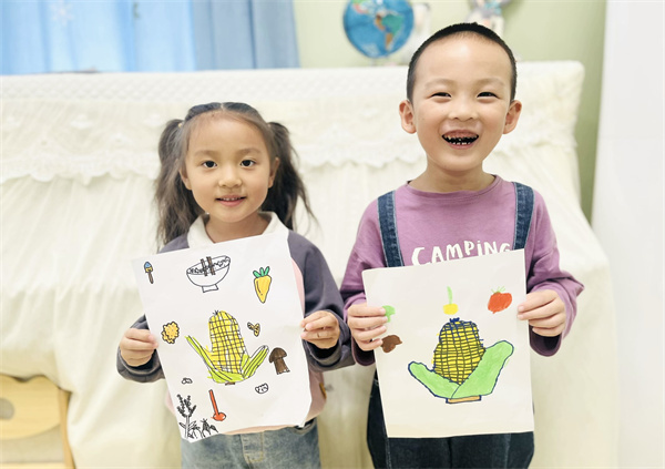 大班幼儿拿起画笔,画出自己心目中珍惜粮食的情景,为爱粮节粮宣传。在绘画过程中,进一步加深幼儿对粮食的认识。同时通过体育游戏《小袋鼠运粮食》体验农民伯伯的辛苦,在游戏中了解粮食的来之不易,萌发爱惜粮食的情感,知道要珍惜粮食,不浪费。