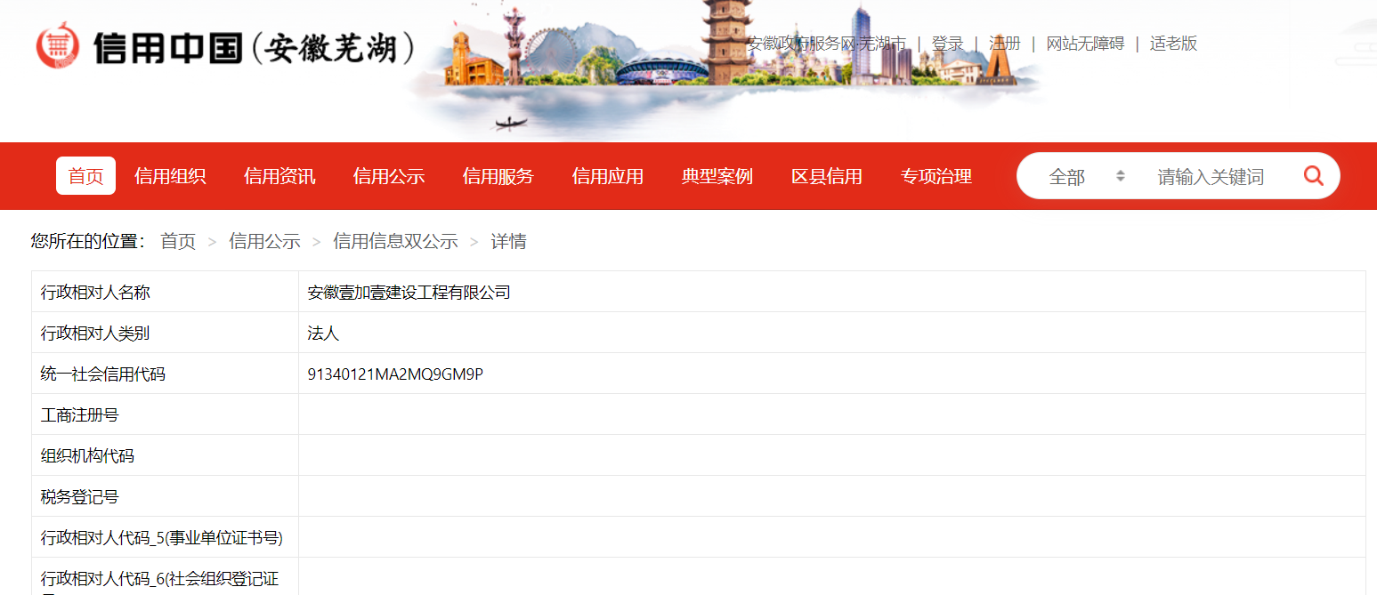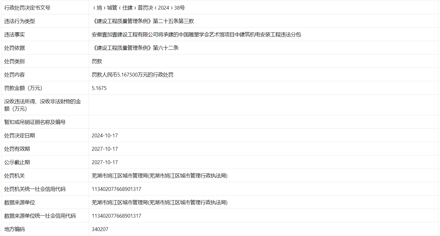 据信用芜湖近日披露行政处罚信息,因将将承建的中国雕塑学会艺术馆项目中建筑机电安装工程违法分包,安徽壹加壹建设工程有限公司被处罚款5.1675,行政处罚决定书文号为﹝鸠﹞城管﹝住建﹞普罚决﹝2024﹞38号
