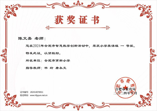 日前,从合肥市教育局主办的“2024年合肥市智慧教学创新活动”中传来喜讯,合肥市育新小学陈文嘉老师获得小学英语组一等奖,并将代表合肥市参加安徽省智慧课堂比赛。