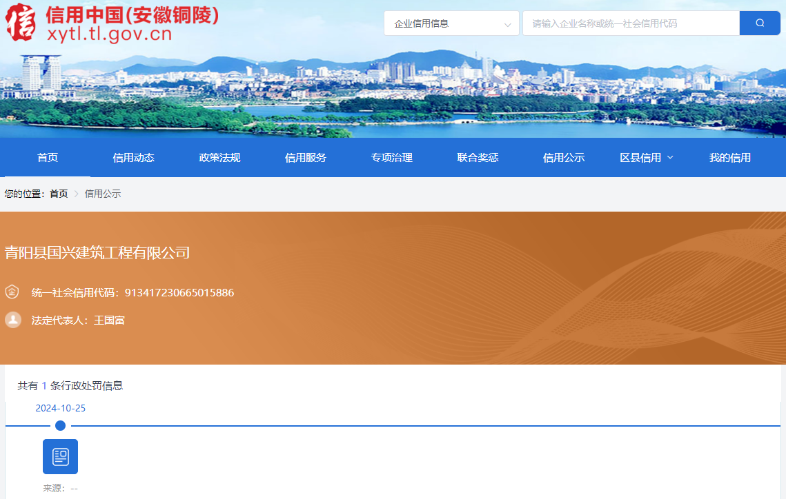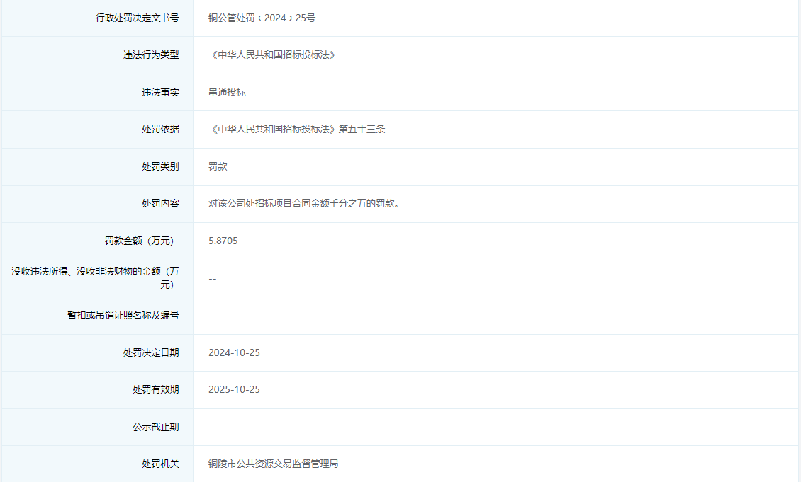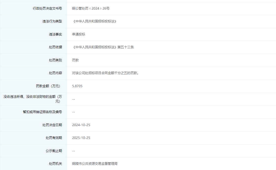 10月25日,信用铜陵披露行政处罚信息,因串通投标,青阳县国兴建筑工程有限公司、安徽鹏宸建筑工程有限公司分别被罚款5.8705万元,行政处罚决定书文号为铜公管处罚﹝2024﹞25号、铜公管处罚﹝2024﹞26号。