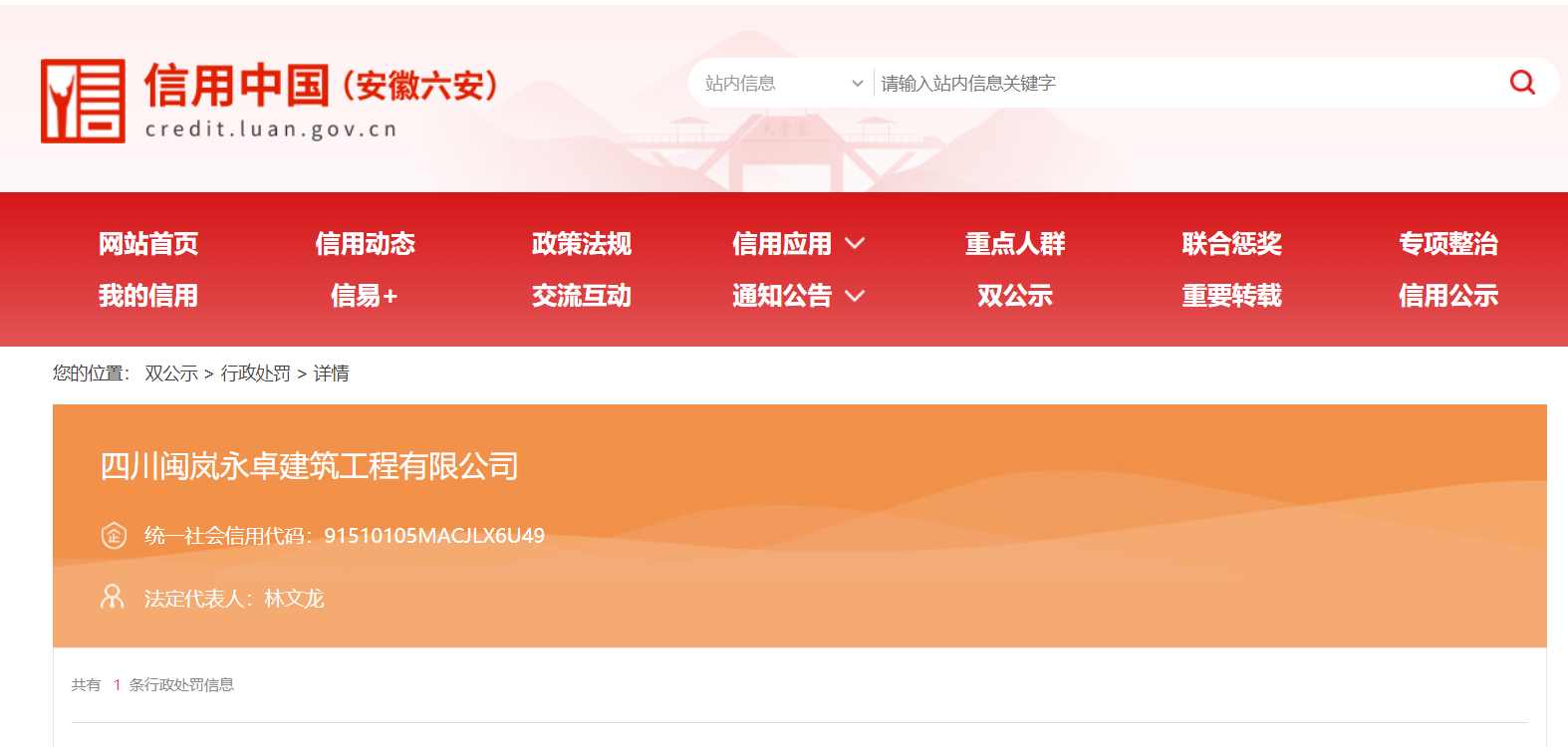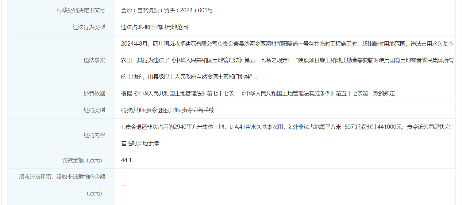 公开处罚信息显示,2024年8月,四川闽岚永卓建筑有限公司负责金寨县沙河乡西河村朝阳隧道一号斜井临时工程施工时,超出临时用地范围,违法占用永久基本农田,非法占用2940平方米集体土地,计4.41亩永久基本农田。