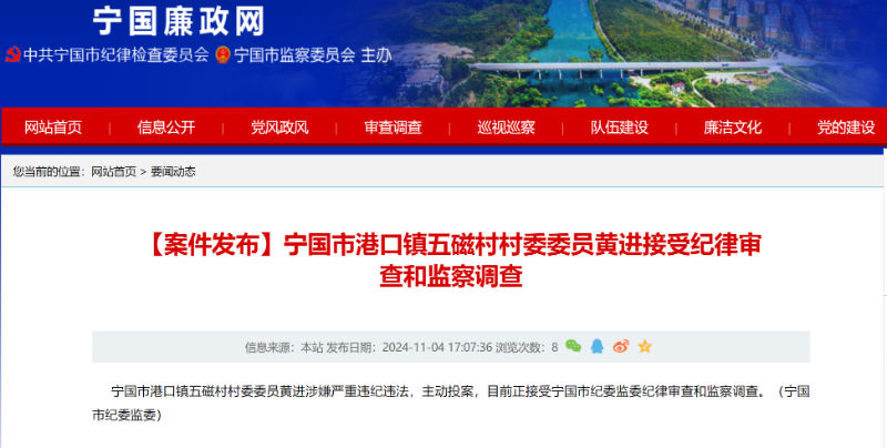 据宁国市纪委监委11月4日消息,宁国市港口镇五磁村村委委员黄进涉嫌严重违纪违法,主动投案,目前正接受宁国市纪委监委纪律审查和监察调查。