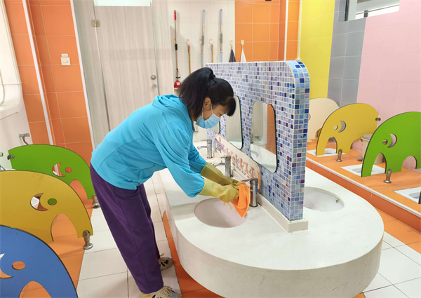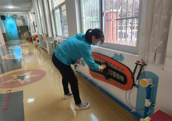 11月4日,各园后勤人员认真对园内的环境进行了彻底的清扫。保育老师在幼儿活动室、午睡房、盥洗室这些重点区域仔细检查确保无消杀残留物。食堂工作人员对食堂的桌面、地面、操作台、餐饮具等处进行了全面细致的清洗消毒,认真履行自己的岗位责任和担当。
