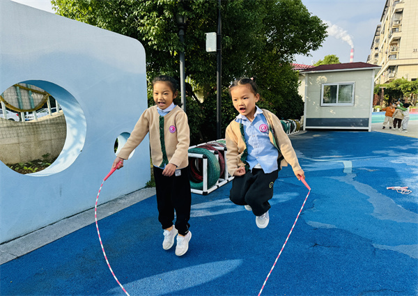 大班的小朋友们可是运动的小能手,他们专注而快乐,紧握着跳绳的把手。口令一出,比赛立刻开始。绳子在空中划出漂亮的弧线,小朋友们的双脚轻快地起落,他们在有节奏的跳跃中感受到了无尽的乐趣。