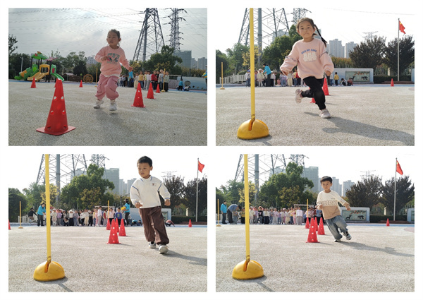 中班的孩子们勇敢地跨越过障碍,奔向前方,他们的脸上写满了专注和决心。当他们冲过终点线时,欢呼声和掌声此起彼伏,小朋友们的脸上都洋溢着成功的喜悦。
