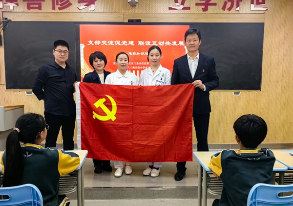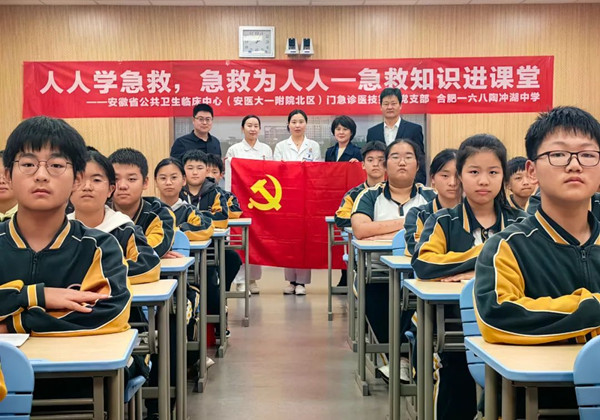 为加强基层服务型、学习型党组织建设,凝聚高质量发展合力,近日,合肥一六八陶冲湖中学党支部与安医大一附院北区门急诊医技第二党支部联谊互动,开展急救知识进课堂活动。本次活动的主题是“人人学急救,急救为人人”。安医大一附院北区门急诊医技第二党支部护理部副主任沈杭与急诊小区主管护师张妙景深入浅出的讲解令同学们印象深刻,活动现场气氛热烈。