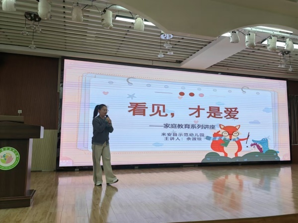 余淑琰老师开展《看见,才是爱》讲座中老师以通俗易懂、生动形象的语言,并且结合具体案例分析等形式,让家长们了解父母的言行对孩子有着极其重要的影响,父母需要了解孩子的身体发育情况、智力发展情况、心理个性发展情况、自我意识发展情况,要多与孩子沟通、多与孩子共同游戏、经常与幼儿园老师沟通的重要性。
