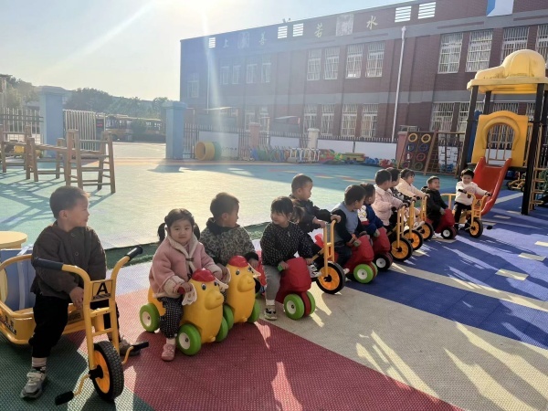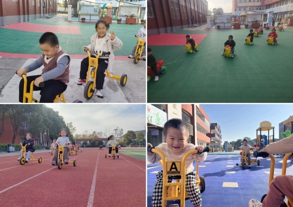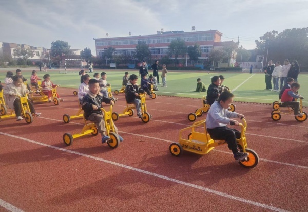 “这些童车真漂亮!”“童车上的小朋友们真帅气!”近日,定远县青山学校附属幼儿园里再添一道亮丽的风景:一群群孩子兴高采烈地骑上一辆辆金黄色的三轮小童车,在老师们的指引下,快乐地在园内成群结队地往来穿梭,随后他们又像一条条小鱼儿奔向学校操场,沿着跑道展开趣味盎然的“童车拉力赛”,尽情享受他们的精彩童真世界。场边观战的师生和家长不禁啧啧赞叹,为孩子们加油喝彩。