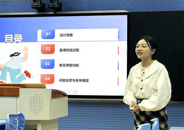 由王倩、姚一婷、陈文嘉三位老师组成的第一团队率先出场。王倩老师带来智慧课堂课例《Unit6 Useful numbers C Reading time》。她立足学生核心素养发展,充分利用智慧课堂的优势,拓展丰富的教学资源,逐步让学生形成“Numbers are helpful.Numbers are different around the world.”的观念和意识。随后,姚一婷、陈文嘉两位老师分别从单元整体分析、磨课过程及课后反思方面,全面呈现小团队在数字主题单元备课的过程。