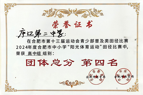 11月5日—8日,合肥市第十三届运动会(青少部)普及类田径比赛2024年合肥市中小学“阳光体育运动”田径比赛顺利结束。庐江二中在本届运动会上取得历史性突破,荣获高中组团体总分第四名。