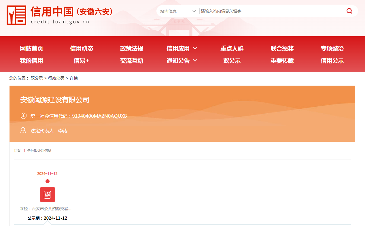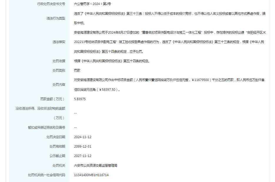 近日,信用六安披露行政处罚信息,安徽闽源建设有限公司因在投标中提供虚假竣工验收报告被罚5.83975万元。行政处罚决定书文号:六公管罚字﹝2024﹞第2号。