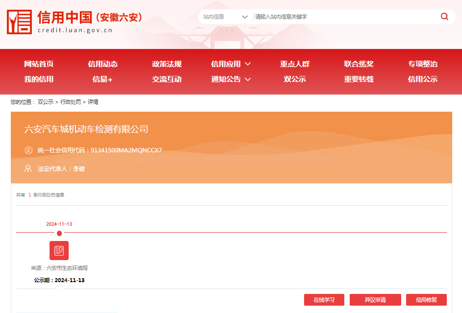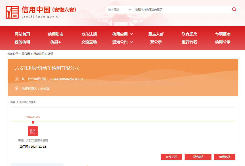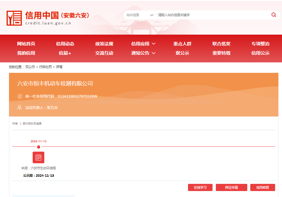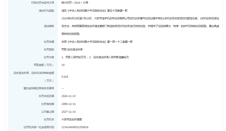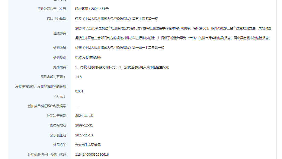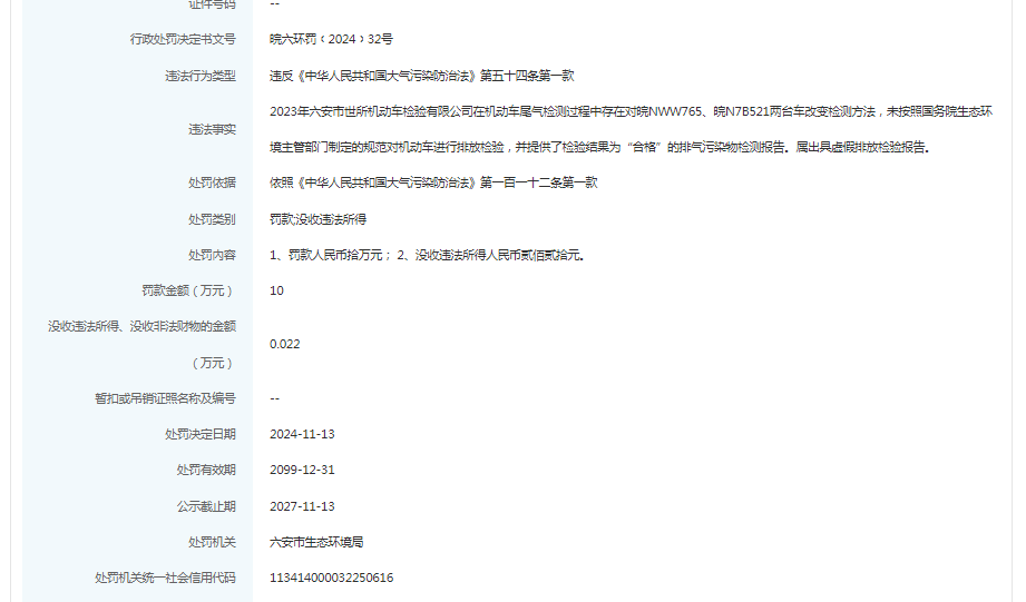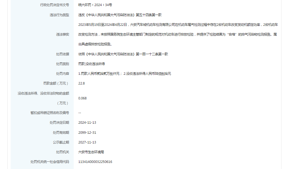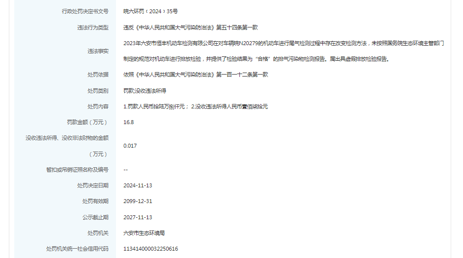 近日,信用六安披露行政处罚信息,六安市新星机动车检测有限公司、六安市世所机动车检测有限公司、六安市恒丰机动车检测有限公司、六安市浩宇机动车检测有限公司、六安汽车城机动车检测有限公司出具虚假排放检验报告被罚。行政处罚决定书文号:皖六环罚﹝2024﹞31号、皖六环罚﹝2024﹞32号、皖六环罚﹝2024﹞35号、皖六环罚﹝2024﹞33号、皖六环罚﹝2024﹞34号。