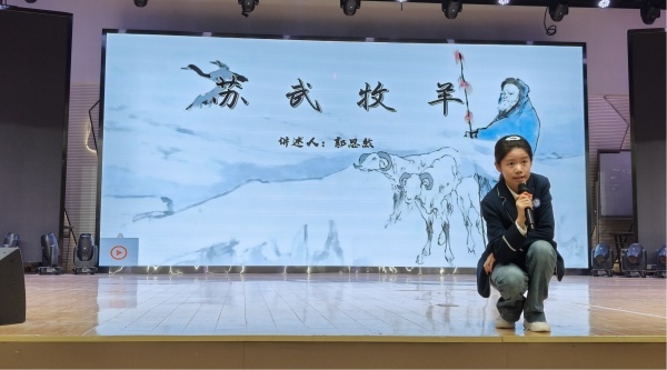 郭思然同学直接以《苏武牧羊》为题,并未过多进行修饰,但她的叙述方式令人耳目一新。她以一人分饰多角的方式展现了苏武被俘后不屈于匈奴的精神与归汉之信念。声情并茂的表演式叙述强化了“历经十九年波折终归汉”带给观众的震撼,使苏武坚贞不屈、忠君爱民的形象深入人心,起到了良好的模范作用。