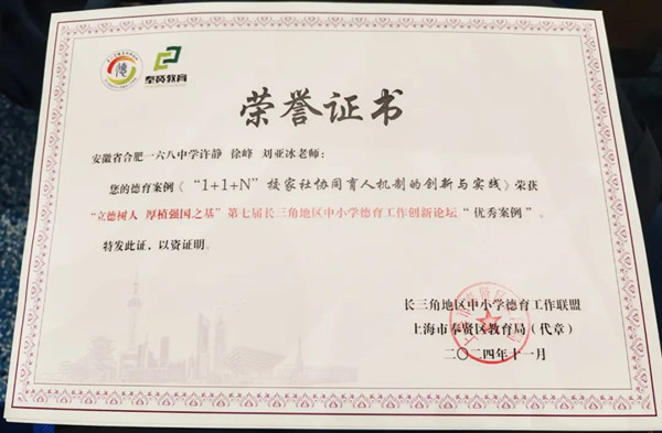 在近日举办的第七届长三角地区中小学德育创新论坛中,合肥一六八中学许静、徐峰、刘亚冰等三位老师报送的德育工作案例《“1+1+N”校家社协同育人机制的创新与实践》荣获“优秀案例”!
