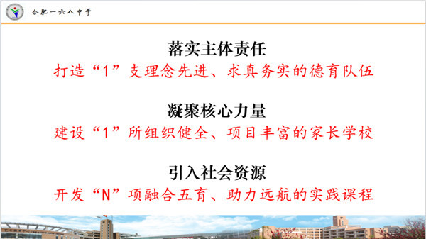 近年来,合肥一六八中学坚持贯彻党的教育方针,遵循教育教学规律和学生成长规律,秉持“为学生幸福人生奠基,为中华民族伟大复兴育才”“把每一位学生都放在心上”的办学理念,立足学校工作实际和学生发展实际,有效整合学校、家庭和社会等各领域教育资源,内练素质(师资队伍建设和学生发展指导)、外聚合力(家庭学校建设和协同课程开发),不断创新协同育人的方式方法,探索构建了“1+1+N”校家社协同育人新模式,即:落实主体责任,打造“1”支理念先进、求真务实的德育队伍;凝聚核心力量,建设“1”所组织健全、项目丰富的家长学校;引入社会资源,开发“N”项融合五育、助力远航的实践课程。