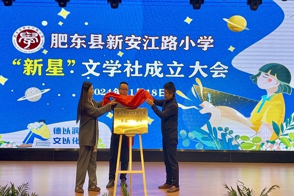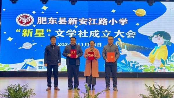 会议伊始,肥东县新安江路小学党支部书记、校长许良富上台致辞,并宣布“新星”文学社成立。随后,许良富与肥东县教体局创城办主任、肥东县教体局校园文学总社社长、安徽省作家协会会员吴蔚芳及中国作家协会会员、肥东县文学艺术院专业作家许俊共同为“新星”文学社揭牌。接着,许良富为“新星”文学社社长程燕、副社长林公义、高级顾问许俊颁发聘书。文学社社员代表殷语同学与指导老师王晶晶先后上台致辞,她们共同希冀文学之花在校园里处处盛开。