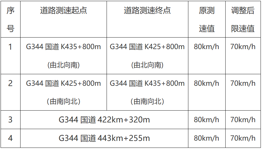 为进一步规范道路通行秩序,保障行车安全,有效预防和减少道路交通事故发生,根据《中华人民共和国道路交通安全法》《中华人民共和国道路交通安全法实施条例》等法律法规规定,决定对G344国道(东灵线)宿州段测速设备及限速值进行优化调整,具体点位及限速值通告如下: