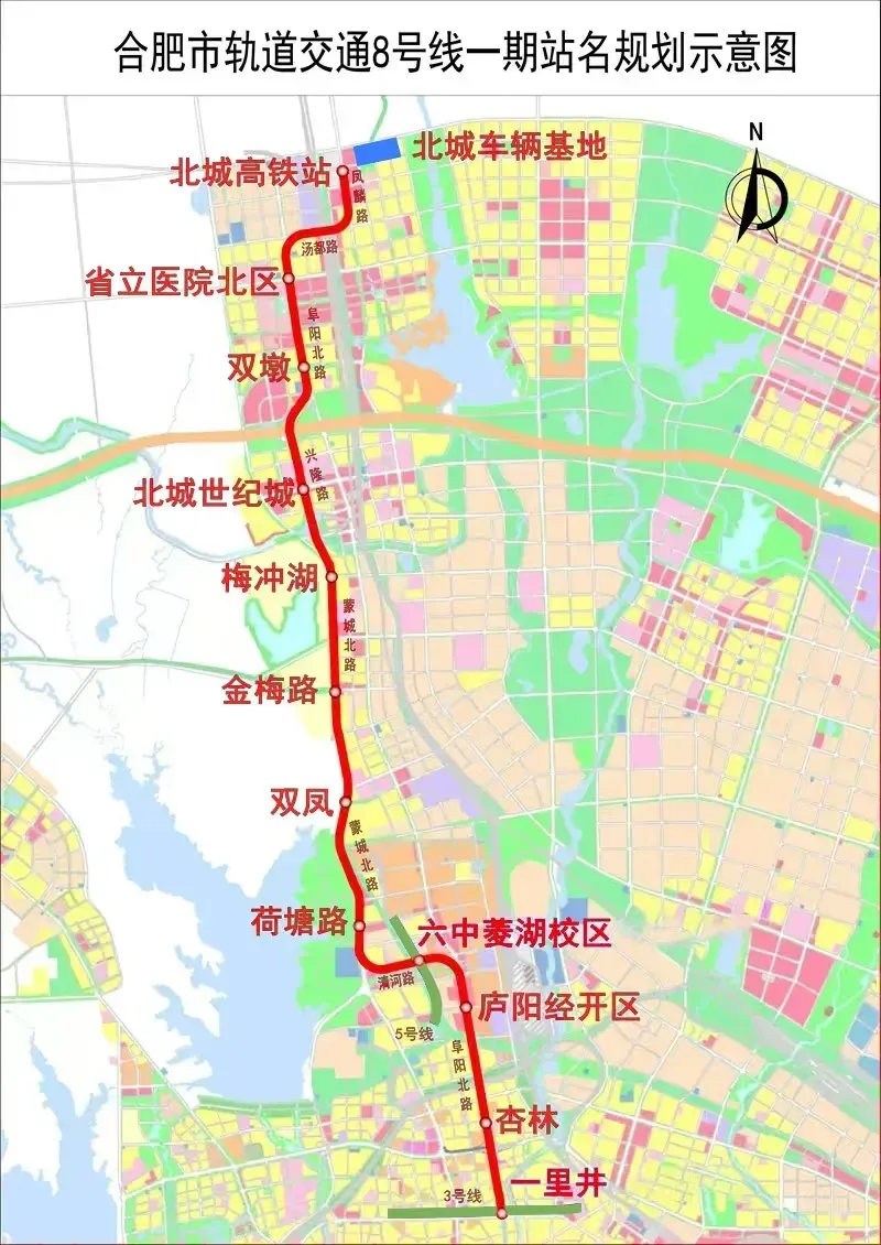 8号线一期南起一里井站、北至北城高铁站,全长22.5公里。线路一共设有车站12座,其中换乘站2座,分别是一里井站(3号线换乘站)、六中菱湖校区站(5号线换乘站)。