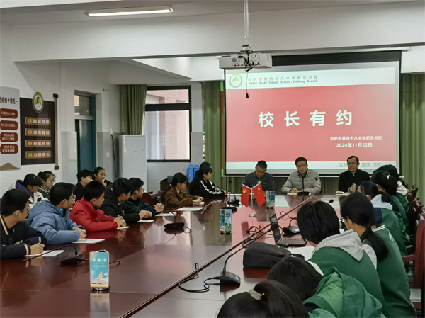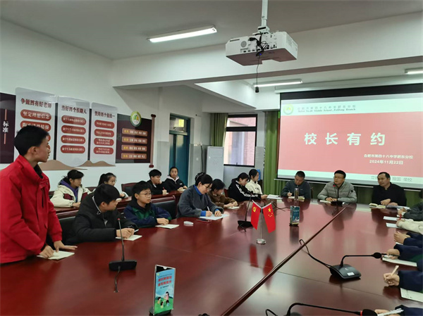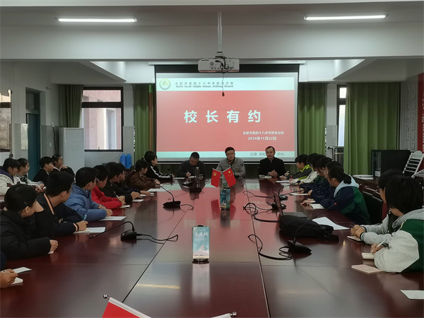 2024年11月22日上午,合肥市第四十八中学肥东分校校园内阳光明媚,一场别开生面的“校长有约”活动在学校会议室热烈进行。此次活动旨在搭建学校管理层与学生之间的沟通桥梁,深入了解学生在校园生活中的需求与困惑,促进学校管理工作的优化与提升。校党支部书记、校长杨威,副校长荚磊、各科室负责人以及各班班长作为学生代表参与了此次活动,围绕食堂就餐、住宿管理、学习情况等多方面话题展开了深入交流与探讨。