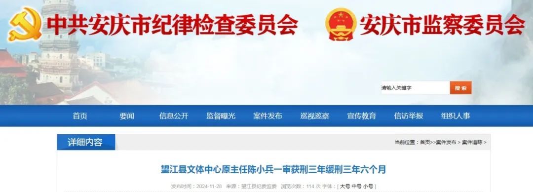 据安庆市纪检监察网11月28日消息,日前,望江县人民法院对望江县文体中心原主任陈小兵受贿罪一案作出一审判决,以受贿罪判处其有期徒刑三年,缓刑三年六个月,并处罚金人民币二十万元;其退缴的违法所得予以没收,上缴国库。