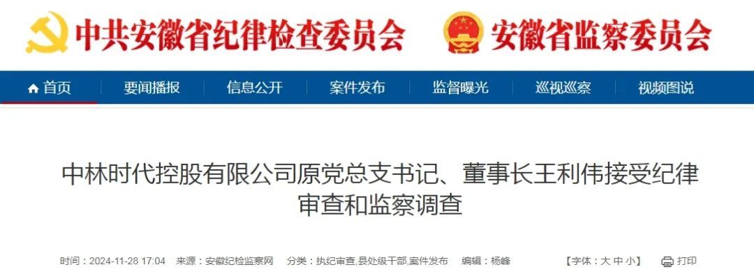据安徽省纪检监察网11月28日消息,中林时代控股有限公司原党总支书记、董事长王利伟涉嫌严重违纪违法,目前正接受中国林业集团有限公司纪委纪律审查和安徽省宣城市监察委员会监察调查。