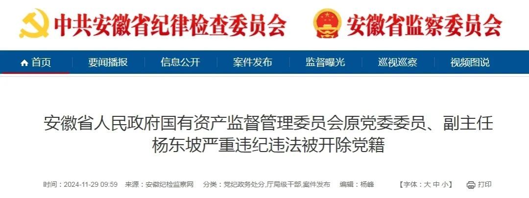据安徽省纪检监察网11月29日消息,日前,经中共安徽省委批准,安徽省纪委监委对安徽省人民政府国有资产监督管理委员会原党委委员、副主任杨东坡严重违纪违法问题进行了立案审查调查。