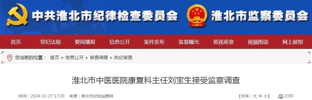 据淮北市纪检监察网11月27日消息,淮北市中医医院康复科主任刘宝生涉嫌严重职务违法,经淮北市监察委员会指定管辖,目前正接受烈山区监察委员会监察调查。