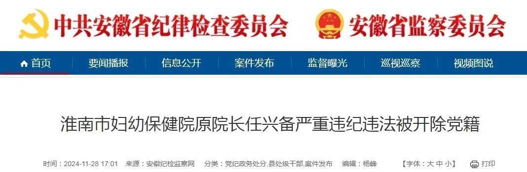 据安徽省纪检监察网11月28日消息,日前,经中共淮南市委批准,淮南市纪委监委对淮南市妇幼保健院原院长任兴备严重违纪违法问题进行了立案审查调查。