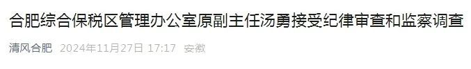 据“清风合肥”微信公众号11月27日消息,合肥综合保税区管理办公室原副主任汤勇涉嫌严重违纪违法,目前正接受合肥市纪委监委纪律审查和监察调查。