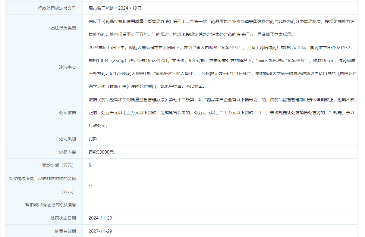 公开信息显示,2024年6月6日下午,购药人桂凤强在护工陪同下,来到当事人内购买“氯氮平片”,上海上药信谊药厂有限公司出品,国药准字H31021152,规格100片(25mg)/瓶, 批号196231201,零售价:9.8元/瓶,在未索要处方的情况下,当事人销售2瓶“氯氮平片”,收款19.6元,该药品属于处方药。6月7日购药人服用1瓶“氯氮平片”陷入昏迷,后经抢救无效于6月11日死亡。安徽医科大学第一附属医院急诊内科出具的《居民死亡医学证明(推断)书》注明死亡原因:氯氮平中毒。予以立案。