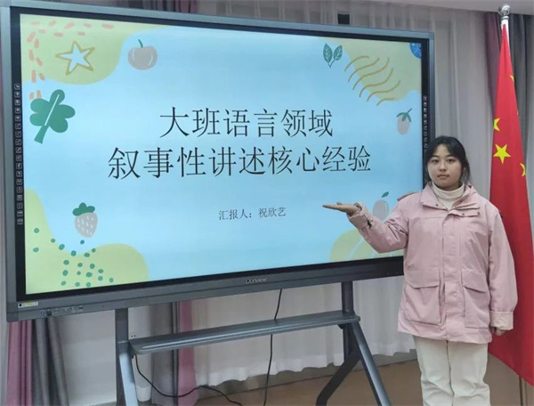 大班祝欣艺老师则聚焦于“语言领域叙事性讲述核心经验”。通过幼儿故事讲述、角色扮演等活动,引导幼儿学习如何组织语言、表达情感、构建情节,从而培养幼儿的叙事能力和语言表达能力。教师们认为,叙事性讲述不仅有助于幼儿的语言发展,还能促进其想象力和创造力的提升。