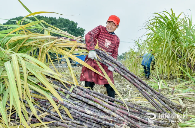 12月4日,铜陵市铜官区西湖镇新圩村甜鲜胜家庭农场的甘蔗地里,蔗农正赶在降温前收获成熟的黑皮水果甘蔗。据悉,该家庭农场今年种了约16亩黑皮水果甘蔗,亩产3000根左右,预计年收益达40余万元。(储著传)