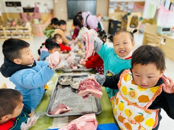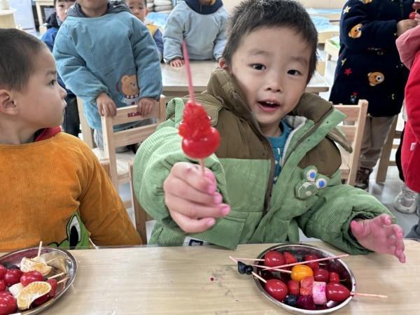 与此同时,小二班的小朋友们也不甘示弱,他们进行了食物礼仪主题活动。在老师的指导下,孩子们亲手腌制咸肉和酱肉,感受传统腌制工艺的魅力。他们还制作了美味的冰糖葫芦,那一颗颗晶莹剔透的糖葫芦不仅口感酸甜可口,更寓意着团团圆圆、甜甜蜜蜜。
