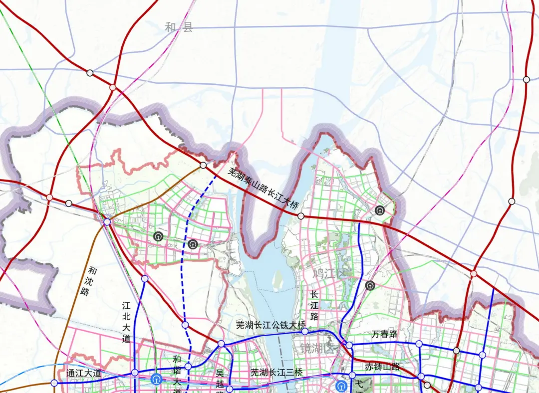 路线从江北沈巷片区北侧穿越至长江北岸,跨越裕溪口水道、陈桥洲、长江主航道至长江南岸,进入芜湖经开区,与长江北路连接线交叉并设置半互通与其衔接,该互通作为过江第一级交通疏解,实现南部沿江工业区快速过江的功能,相关连接线及收费站同步建设;