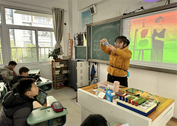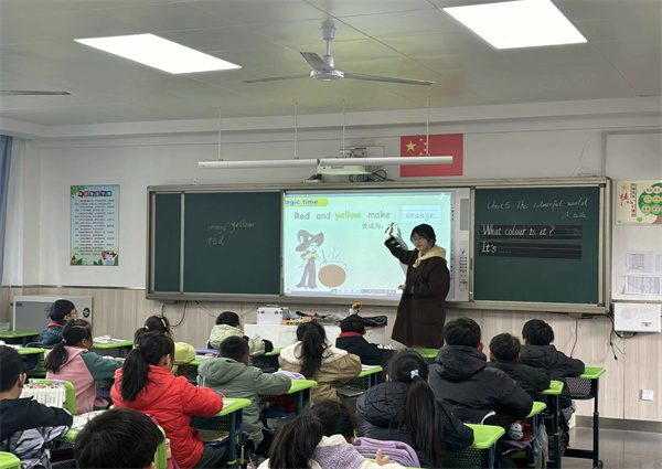 低年级段课堂率先登场,紧扣跨学科融合理念,将英语课与美术课巧妙结合,围绕“the colorful world”开展相关主题教学。授课教师把英语单词、简单句型的学习嵌入美术手工、色彩调配实操里,学生们边动手调配颜色,边用英语描述颜色变化,沉浸式掌握知识,课堂上欢声笑语不断。