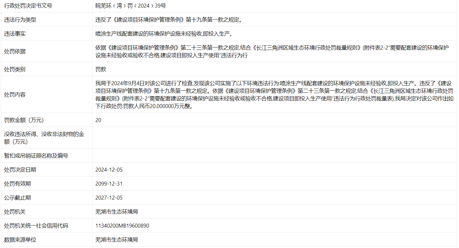 近日,信用芜湖披露行政处罚信息,因环保设施未验收擅自投产,芜湖科莱特光电科技有限公司被罚款20万元。行政处罚决定书文号为皖芜环﹝湾﹞罚﹝2024﹞39号。