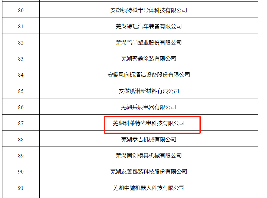 日前,芜湖市工业和信息化局公布《芜湖市2024年第二批创新型中小企业评价结果》公示公告,芜湖科莱特光电科技有限公司位列其中。